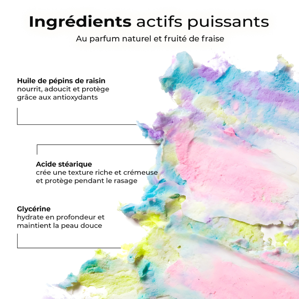 - Pendant le rasage, la peau reste hydratée, apaisée et protégée des microcoupures et des irritations.